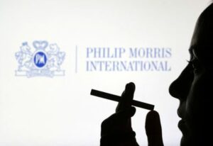 A woman poses with a cigarette in front of Philip Morris International logo in this illustration taken July 26, 2022. REUTERS/Dado Ruvic/Illustration