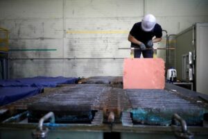 An employee holds a recycled copper plate at an urban mining plant in Gunsan, South Korea, April 2, 2018. Picture taken on April 2, 2018. REUTERS/Kim Hong-Ji