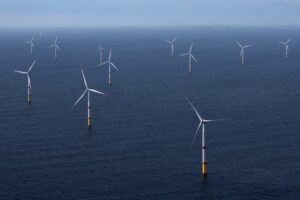 FOTO DE ARCHIVO. Una vista aérea muestra los aerogeneradores del parque eólico marino de Saint-Nazaire, frente a la costa de la península de Guerande, en el oeste de Francia, 2 de octubre, 2025. REUTERS/Stephane Mahe