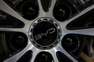 FILE PHOTO: A BYD logo is displayed on a car at a dealership in Sant Cugat del Valles, near Barcelona, Spain, September 12, 2025. REUTERS/ Albert Gea/File Photo