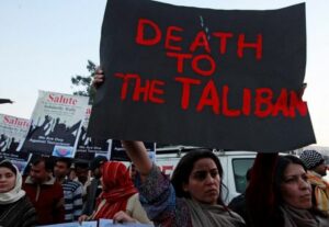 ARCHIV: Eine Frau hält ein Schild während einer Protestkundgebung der Zivilgesellschaft gegen den Terrorismus in Lahore am 16. Januar 2015. REUTERS/Mohsin Raza/File Photo