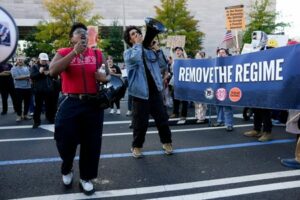 Kristen “KB” Bonner y Merawi Gerima, que forma parte de DC against Trump y DC Alliance Against Racist & Political Repression, dirigen un cántico durante una protesta “No Kings” contra las políticas del presidente estadounidense Donald Trump, en Washington, D.C., Estados Unidos, 18 de octubre de 2025. REUTERS/Leah Millis