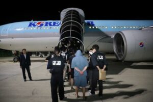 South Korean police officers escort South Korean nationals suspected of being involved in online scam operations, as they board a Korean Air aircraft at the Techo International Airport, Kandal province, Cambodia, October 18, 2025. Agence Kampuchea Press/Handout via REUTERS