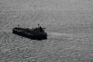 ARCHIV: Eine Luftaufnahme zeigt den Öltanker Boracay (auch Pushpa genannt), gegen den die französischen Behörden ermitteln und der im Verdacht steht, zur so genannten “Schattenflotte” zu gehören, die in den russischen Ölhandel verwickelt ist, vor der Küste der westfranzösischen Hafenstadt Saint-Nazaire, Frankreich, 2. Oktober 2025. REUTERS/Stephane Mahe