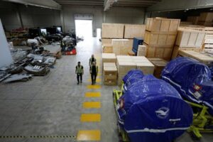 Aeronautical technicians walk past engines packed away in the hangar where the company Ecube carries out aircraft storage, dismantling, recycling and transition services, at Castellon Airport in Castellon, Spain, October 16, 2025. REUTERS/Eva Manez
