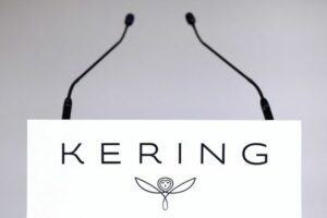 The logo of French luxury group Kering is seen on a desk before an extraordinary shareholder meeting of Kering at the company’s headquarters in Paris, France, September 9, 2025. REUTERS/Tom Nicholson