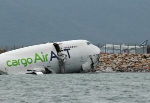 Un avión de carga yace parcialmente en el mar tras desviarse de la pista durante el aterrizaje en el Aeropuerto Internacional de Hong Kong en Hong Kong, China. 20 de octubre de 2025. REUTERS/Tyrone Siu