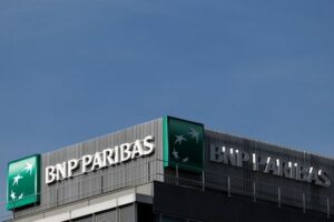 The logo of BNP Paribas is seen outside a bank building in Rueil-Malmaison, near Paris, France April 14, 2025. REUTERS/Stephanie Lecocq