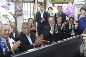 Supporters of Sanae Takaichi react as she is elected as Japan’s new Prime Minister, in Yamatokoriyama, Nara prefecture, Japan, October 21, 2025 in this photo taken by Kyodo. Mandatory credit Kyodo/via REUTERS