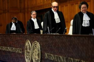 Jueces, entre ellos Yuji Iwasawa, llegan a la sesión de la Corte Internacional de Justicia (CIJ) el día en que se emite una Opinión Consultiva no vinculante sobre las obligaciones de Israel en relación con la presencia y las actividades de las Naciones Unidas y otros actores internacionales en el territorio palestino ocupado, en una sesión pública en La Haya, Países Bajos. 22 de octubre de 2025. REUTERS/Piroschka van de Wouw