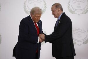 U.S. President Donald Trump and Turkish President Tayyip Erdogan shake hands as they pose for a photo, at a world leaders’ summit on ending the Gaza war, amid a U.S.-brokered prisoner-hostage swap and ceasefire deal between Israel and Hamas, in Sharm el-Sheikh, Egypt, October 13, 2025. Yoan Valat/Pool via REUTERS