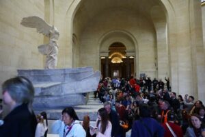 Visitors walks past the Victoire de Samothrace (The Winged Victory of Samothrace) marble statue displayed at the top of the Daru staircase at the Louvre Museum on the day it reopened to the public for the first time since last Sunday’s heist, while the Galerie d’Apollon where eight pieces of Napoleon and the Empress’s jewelry collection displayed in the gallery were stolen by thieves, remains closed, in Paris, France, October 22, 2025. REUTERS/Gonzalo Fuentes