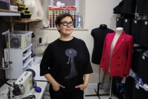 Irina Pankratova, head of the Artel tailor shop, poses for