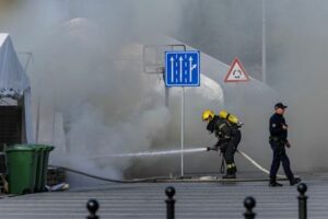 A firefighter works as smoke rises from a burning tent following an incident in front of the Parliament in Belgrade, Serbia, October 22, 2025. REUTERS/Djordje Kojadinovic