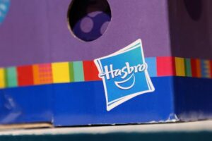 FILE PHOTO: The Hasbro logo is seen on a toy for sale in a store in Manhattan, New York, U.S., November 16, 2021. REUTERS/Andrew Kelly/File Photo