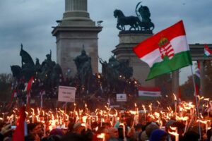 People hold torches as they listen to the speech given by Peter Magyar, leader of the opposition TISZA party, to mark the 69th anniversary of the Hungarian Uprising of 1956, in Budapest, Hungary, October 23, 2025. REUTERS/Bernadett Szabo