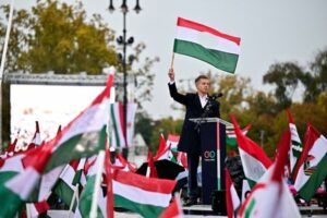 Peter Magyar, leader of the opposition TISZA party, waves a Hungarian flag during a demonstration organised by the opposition TISZA party as part of events marking the 69th anniversary of the Hungarian Uprising of 1956, in Budapest, Hungary, October 23, 2025. REUTERS/Marton Monus