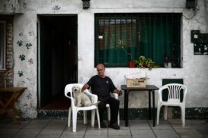 Luis Relinque, de 75 años, se sienta junto a su perro mientras vende alfajores y otros dulces para llegar a fin de mes, ya que su jubilación no le alcanza para vivir, en las afueras de su casa en Buenos Aires, Argentina, el 14 de febrero de 2025. REUTERS/Tomás Cuesta