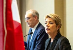 ARCHIV: Die Schweizer Bundespräsidentin Karin Keller-Sutter und der Schweizer Bundesrat Guy Parmelin sprechen mit den Medien, nachdem sie sich vor den Handelsgesprächen in Genf, Schweiz, am 9. Mai 2025 zu separaten bilateralen Treffen mit chinesischen und US Delegationen getroffen haben. REUTERS/Denis Balibouse/File Photo