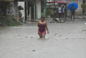 Una mujer camina por una calle inundada en medio de las lluvias provocadas por la tormenta tropical Melissa, en Santo Domingo, República Dominicana. 24 de octubre de 2025. REUTERS/Eddy Vittini