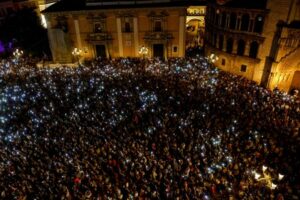 Protesters light up their mobile phones at the same time as the official alarm sounded on the day of the deadly floods, as relatives of flood victims and demonstrators take part in a march demanding the resignation of Carlos Mazon over his handling of the deadly flood crisis in October 2024, in Valencia, Spain, October 25, 2025. REUTERS/Eva Manez