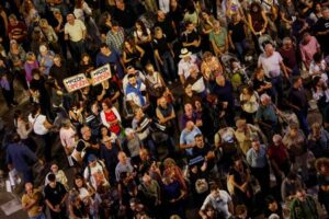 Relatives of flood victims and demonstrators take part in a march demanding the resignation of Carlos Mazon over his handling of the deadly flood crisis in October 2024, in Valencia, Spain, October 25, 2025. REUTERS/Eva Manez