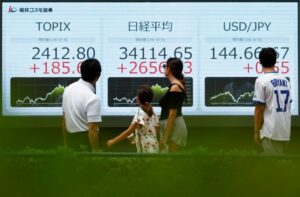 FOTO DE ARCHIVO-Transeúntes miran un tablero electrónico fuera de una correduría en Tokio, Japón. 6 de agosto de 2024. REUTERS/Willy Kurniawan