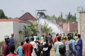 A water tank, in the grounds of a property near that of Cameroonian presidential candidate Issa Tchiroma, leaks after being pierced by rocks thrown by protesters after the announcement of the electoral victory for President Paul Biya, in Garoua, Cameroon, October 27, 2025. REUTERS/Desire Danga Essigue