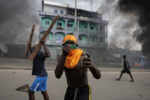 Supporters of the Cameroon opposition candidate Issa Tchiroma carry objects as they clash with security forces after the Constitutional Council declared President Paul Biya the winner of the October 12 presidential election in Douala, Cameroon, October 27, 2025. REUTERS/Zohra Bensemra