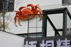 A hairy crab model hangs on the wall at a specialty seller in Qingshui village in Suzhou, Jiangsu province, China, October 21, 2025. REUTERS/Go Nakamura