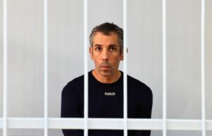 French cyclist Sofiane Sehili, who was reportedly arrested after twice attempting to cross the Russian border from China while trying to break the world record for the fastest cycle crossing of the Eurasian landmass, from Lisbon to Vladivostok, sits inside an enclosure for defendants before a court hearing in the far eastern settlement of Pogranichniy, Russia, October 23, 2025. REUTERS/Tatiana Meel