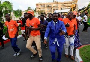 Supporters of Ivory Coast’s President Alassane Ouattara, who is seeking a fourth term, celebrate after provisional results were announced by the electoral commission indicating his victory in the presidential election, in Abidjan, Ivory Coast October 27, 2025. REUTERS/Luc Gnago