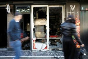 People walk past a demolished Turkish owned restaurant in downtown, after a man was stabbed and wounded in a late-night incident in Podgorica, Montenegro, October 27, 2025. REUTERS/Stevo Vasiljevic
