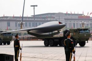 FILE PHOTO: Members of the People’s Liberation Army stand as unmanned operations group display a drone during a military parade to mark the 80th anniversary of the end of World War Two, in Beijing, China, September 3, 2025. REUTERS/Tingshu Wang/File Photo