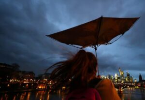 ARCHIV: Eine Frau trotzt starkem Wind und heftigem Regen, während sie versucht, ein Foto von der Skyline zu machen, in Frankfurt, Deutschland, 3. Februar 2021. REUTERS/Kai Pfaffenbach TPX IMAGES OF THE DAY