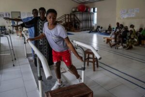 Ajuamungu Kikoba, 17, takes part in a physical rehabilitation session after receiving a new prosthesis, at the Shirika la Umoja orthopedic center in Goma, North Kivu Province, eastern Democratic Republic of Congo, August 22, 2025. Kikoba lost her leg due to the armed conflict between the M23 rebels and the Congolese army. REUTERS/Arlette Bashizi
