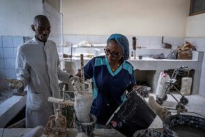 Ortho-prosthetist Wivine Kavira Mukata, 28, and Dieudonne Zukpa, 56, prepare a prosthesis for Ajuamungu Kikoba, 17, a patient who came to have her prosthesis changed at the Shirika la Umoja orthopedic center, after losing her leg in clashes between the M23 rebels and the Congolese army, in Goma, North Kivu Province, eastern Democratic Republic of Congo, August 20, 2025. REUTERS/Arlette Bashizi SEARCH “BASHIZI GOMA AMPUTEES” FOR THIS STORY. SEARCH “WIDER IMAGE” FOR ALL STORIES.