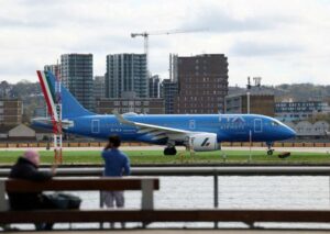 FILE PHOTO: People watch as an ITA Airways Airbus A220-100 takes off from London City Airport in London, Britain, April 11, 2024. REUTERS/Isabel Infantes/File Photo