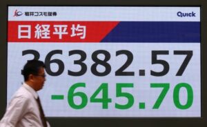 FOTO DE ARCHIVO-Un peatón pasa junto a una pantalla que muestra el Nikkei de Japón fuera de una agencia de valores en Tokio, Japón. 11 de marzo 2025. REUTERS/Kim Kyung-Hoon