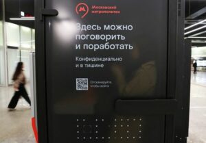 A woman uses a sound-proof booth at Nizhegorodskaya metro station in Moscow, Russia, October 28, 2025. The sign on the door reads: “Here you can talk and work. Confidentially and in silence.” REUTERS/Anastasia Barashkova
