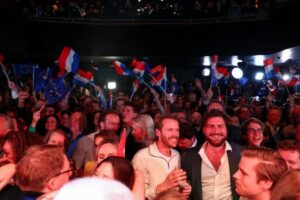 Democrats 66 (D66) supporters react as they await exit poll results in the Dutch parliamentary elections in Leiden, Netherlands, October 29, 2025. REUTERS/Piroschka van de Wouw