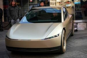FILE PHOTO: A person sits in a Tesla Cybercab outside the Nasdaq Market site in New York City, U.S., October 27, 2025. REUTERS/Brendan McDermid/File Photo