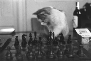 British journalist Anthony Grey’s cat plays with chess pieces on a table, in this undated handout image obtained by Reuters on October 28, 2025. Grey family collection/Handout via REUTERS