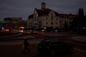 Vehicles drive through the city centre during a power outage after critical infrastructure was hit in a Russian drone attack, in Chernihiv, Ukraine October 21, 2025. REUTERS/Alina Smutko
