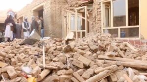 People gather near a damaged building, in the aftermath of an earthquake, in Tashqurghan district, Samangan province, Afghanistan, November 3, 2025. Reuters TV/via REUTERS