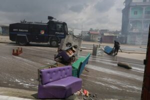 A member of security forces removes barricades during clashes with supporters of Cameroon opposition candidate Issa Tchiroma, after the Constitutional Council declared President Paul Biya the winner of the October 12 presidential election, in Douala, Cameroon, October 27, 2025. REUTERS/Zohra Bensemra/File Photo
