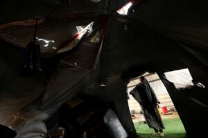 A displaced Palestinian woman shows her torn tent, amid a ceasefire between Israel and Hamas, in Gaza City, November 4, 2025. REUTERS/Mahmoud Issa