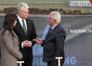 Rheinmetall CEO Armin Papperger speaks with Lithuania’s Prime Minister Inga Ruginiene and President Gitanas Nauseda during the German defence group Rheinmetall’s new factory groundbreaking ceremony in Baisogala, Lithuania, November 4, 2025. REUTERS/Janis Laizans