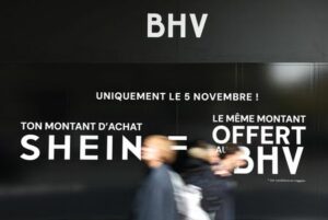 People walk past a logo of Chinese fast-fashion retailer Shein displayed on a storefront window of the Bazar de l’Hotel de Ville, Le BHV Marais department store, ahead of the opening of Shein’s fast fashion first permanent shop in Paris, France, November 3, 2025. REUTERS/Abdul Saboor
