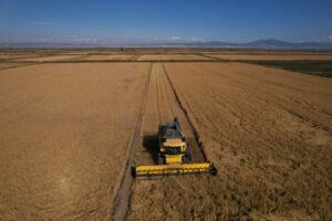 A drone image shows a combine harvester reaping rice in a field in Chalastra, Greece, October 24, 2025. REUTERS/Alexandros Avramidis